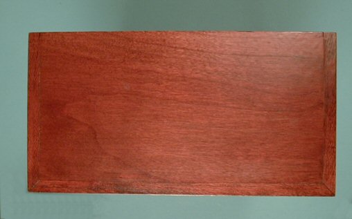 What a fabulous piece made by Roger Gutheil. The splendid bracket feetl are very delicately formed. The doors are raised paneled and when the door is open, one can see it has been made from numerous pieces. The top, which is pictured, is made from 4 separate pieces and bevels downwards. The interior has two bottom drawers with brass pull handles with brass escutcheons and brass hinges. There is also a high shelf and wooden pegs to hang clothes. Made from cherry wood and finished in a velvety smooth finish. Brass key holes and it even has a tiny brass key in one of the holes. This piece is so superb, it is hard to describe. 6 l/2" h., 4 3/8" w. 2 3/8" d. Marked on the bottom: R.L.Gutheil. Made c. 1980. Great condition with no breaks or repairs. The collection pictured here and in the following pictures were all purchased in 1979 and 1980 from Mr. Gutheil and were obtained from one collection.