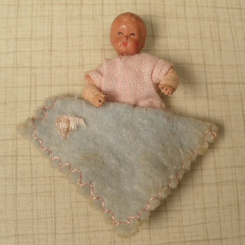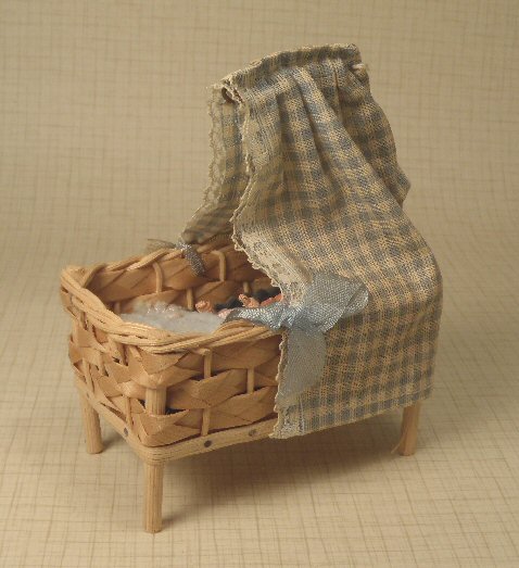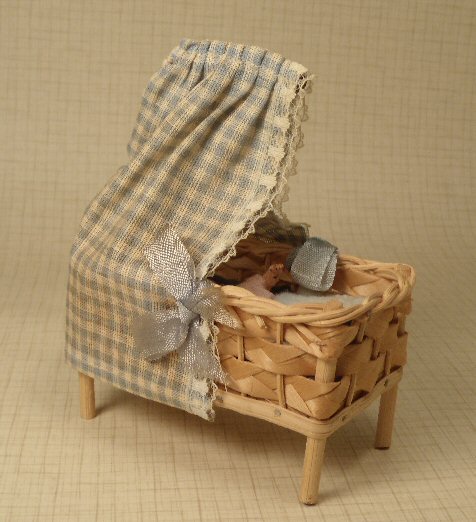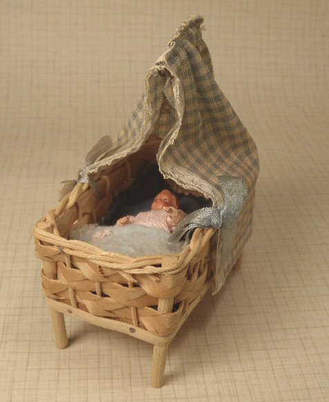 What a darling ensemble consisting of a Caco baby laying in a wicker bed with original blue and white checked canopy decorated with lace and blue ribbons c. 1950. The original canopy is held on by metal wire. The inside mattress is a lovely deep blue velvet. The Caco baby has a sweet little face, with metal hands and metal blue painted baby shoes and she wears her original pink baby gown. Her original blue blanket is edged with pink thread and a pink ribbon to match and the blanket is stitched to the pink baby gown so that it is permanently attached. The wicker bed is wonderful and is very faintly marked West Germany on the bottom; I used a magnifying glass to see it. The baby is 2 1/8" long and in beautiful condition. 1" scale great for the mid-1900's dollhouse. Bed is 3 3/4" long and 5 1/4" high to the top of the canopy. Very minimal wear or aging.
