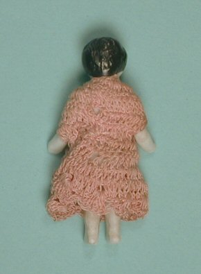 Sweet little frozen Charlotte doll that is 2 3/16" high with molded and painted black hair. She wears her very delicate original pink crocheted dress. Her arms come forward and her feet have lightly molded flat-soled boots. Her face is very delicately painted. Frozen Charlotte dolls are not jointed and made in one piece. This one is quite early, most likely around 1875-80 period. Nice condition with no breaks or repairs. Made in Germany.