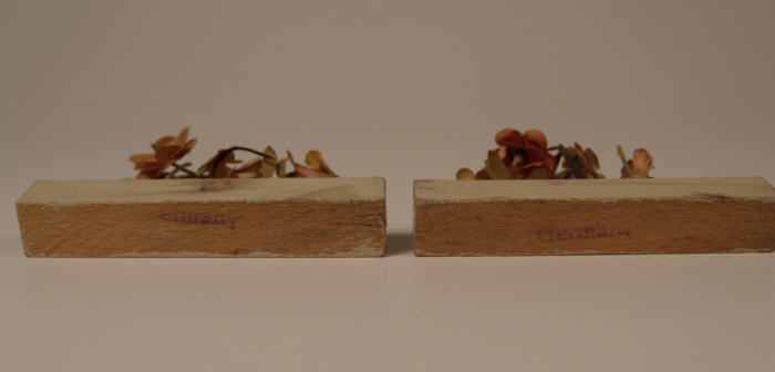 Great matching flower boxes for a dollhouse or garden made most probably by Gottschalk in Germany c. 1910 era. They are stand alone and made this way and were not taken off of an existing dollhouse. Extremely hard to find. 1 inch scale. Each wooden box is 2 1/4" long by 5/16" deep. Overall height at highest point is 1 1/4". Flowers are fabric on green covered wire. Each box is marked Germany underneath as shown. Good condition, there is some wear on the flowers. The price includes both flower boxes.