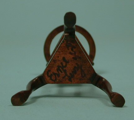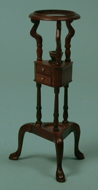 Ernie Levy was one of the best known miniaturists of the second half of the 1900's. He is most well-known for his fine quality 1" scale dollhouse furniture made from mohagany and other fine woods and is featured in numerous museum collections. Pictured is a basin stand made very delicately and finely with great curvatures and fine cabriole legs with padded feet. There are 2 tiny triangular shaped draws with miniscule brass pulls which are removable. The workmanship is particularly fine on this piece, dark mahogany with a satiny, soft finish. All in great condition. Height is 3 1/4". Signed on the bottom, Ernie Levy 4-77, which is also pictured.