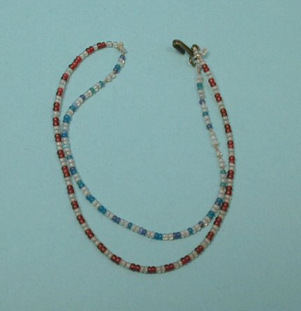 The glass beads on this splendid Victorian doll's necklace has the tiniest beads. It contains two rows of glass beads, the outer portion is red and white and the inner poriton is blue and white. Has early brass hook closure. Shown with ruler for size comparison. Very wonderful and so rare. c. 1880.