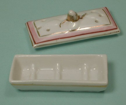 Very early rectangular soap dish with its matching cover that has tiny holes on the top for the wetness to evaporate, but yet keeps the soap nice and clean. The cover has a floral shaped handle and is docorated with pink, maroon and gold lines at the edges. The base has raised portions for the soap to rest on and has a gold line as a decoration on the outside. Nice condition with no breaks or repairs--one small round bubble burst on the bottom portion which was part of the manufacturing process. c. 1875. Made in Germany. No markings. Great accessory for a doll. 2 1/2" long by 1 1/4" wide. This matches the square soap dish which is being sold separately.