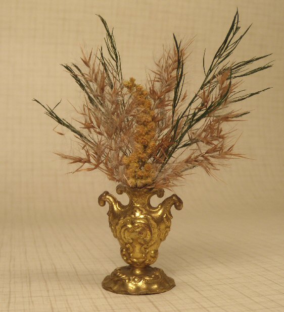 Fabulous ormolu vase made in Germany by Erhard and Sohne. The stunning gold gilt ormolu vase has two protruding side handles and beautifully impressed designs on the surface and wide round base. It has a lovely dried arrangement. Height of vase is 1 1/2" and overall height with arrangement is 3 1/4". Shown on a Schneegas dresser which is 4 1/2" high at the highest point of backsplash, for size comparison--dresser is sold separately. c. 1900. All in lovely condition.