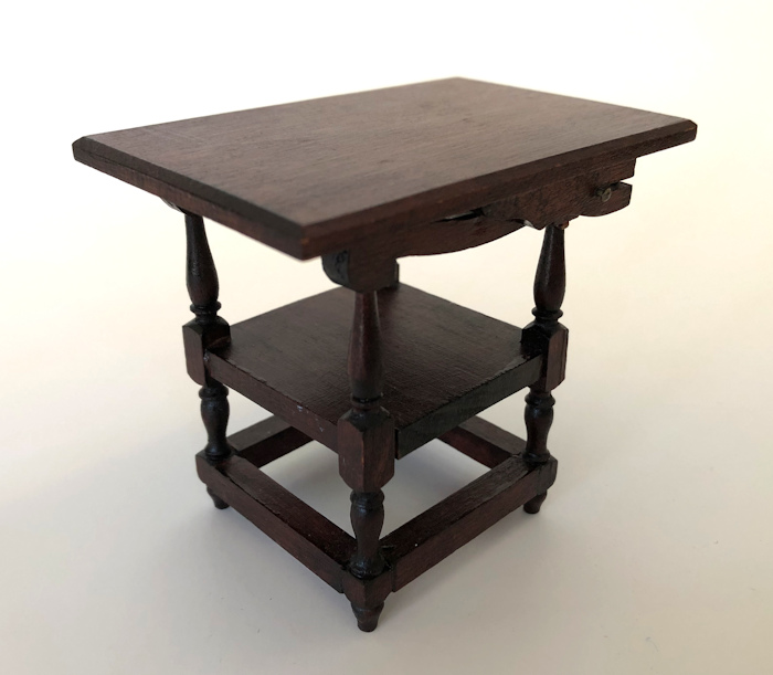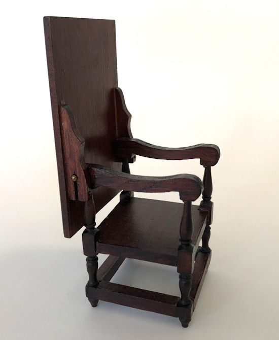 Well made German cherry table which cleverly turns into an arm chair.c. 1900-10 period. All 4 legs are turned in a lovely design and when the top is folded up, it is a grand-looking arm chair fit for the master of the dollhouse. The dark cherry finish is very nice and smooth and well rubbed, with great patina. The top has beveled edges. Great condition with no breaks or repairs. Dimensions when in table position: 3 1/8" high and 3 5/8" long, 2 3/8" deep. Dimensions when in chair position: 2" wide, 2 3/8" deep, 5 1/4" high at the highest point. No markings, just a price in pencil.