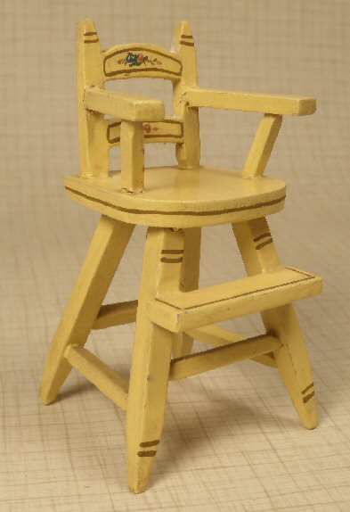 What a lovely early baby's high chair made by Tynietoy from Providence, R.I., c. 1925. Lovely yellow enameling highlighted with outlines and the 2 back rests with tiny delicate flowers hand painted. I have researched and wrote articles on hand painted Tynietoy dollhouse furniture for Antique Doll Collector. Their hand painted dollhouse furniture is some of the best and most coveted in America. For a list of the articles I have written on dollhouse furniture, please see my category, Articles & News From The Doll Works. This lovely high chair is 3 1/4" high and is in great condition.