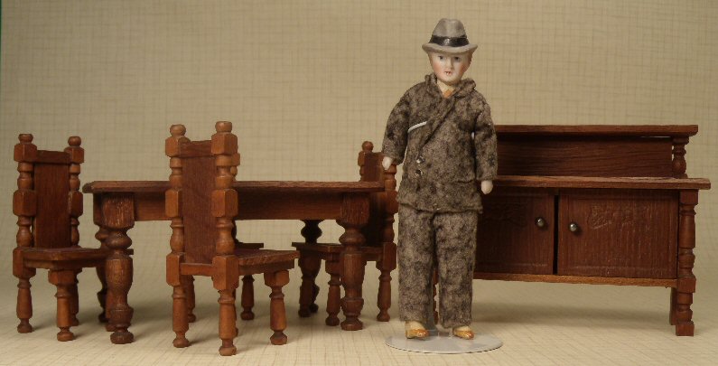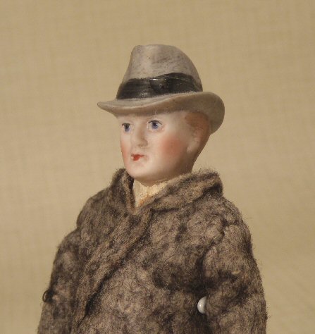 Great dollhouse gentleman with the rare feature of a molded bisque fedora hat on his head made by the Kestner firm in Germany c. 1915-20 era. The molded fedora is gray with a black painted band, which matches his gray/black mottled original felt suit which has Dresden paper buttons. He also wears his original white shirt and mustard yellow tie, which matches his very fancy yellow mustard molded bisque shoes and spats. He is 5" tall and is perfect for the slighly smaller than 1" scale dollhouse, similar to those made by Gottschalk, Schoenhut, Bliss and many others. He is also pictured with a German dining set (set sold separately) for size comparison and how handsome he looks in a setting. He is in great condition, all original, with no breaks or repairs. Dollhouse dolls with extras, like the molded hats, are getting harder and harder to find, especially in all original clothing.