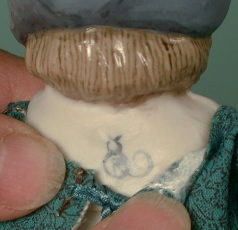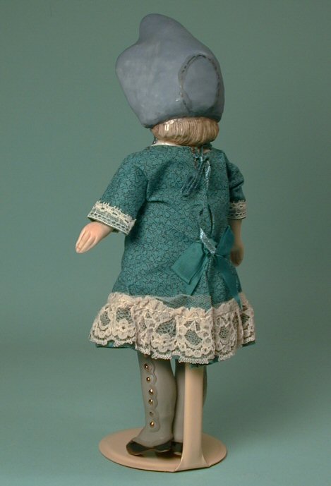 I have been told by an astutue customer that this doll is a portrait of Eleanor Roosevelt as a child. The doll was hand made by Kathy Redmond who is a nationally known American doll artists, has exhibited at 28 UFDC National Conventions and is famous for her children, historical figures and portrait dolls. Pictured is a young girl doll by Kathy Redmond who has an incredibly modeled face with molded blue bonnet edged in porcelain lace and a molded lacy blouse with a gold necklace on her breastplate. The work on this doll is beautifully executed. Her body is cloth with bisque head, hands and legs. Her high black and grey boots have gold buttons as can be seen in the photo. Her elaborate outfit consists of underclothes, a sweet lacy blue & black dress, and a velvet overcoat with attached capelet trimmed in white fur and also at the sleeves. She is a lovely young girl with a darling pouty face. 9 3/4". Signed in the back as shown with Kathy Redmond's logo. Beautiful & clean condition with no breaks or repairs. Kathy Redmond is listed in the major doll value books as an important American doll artist.