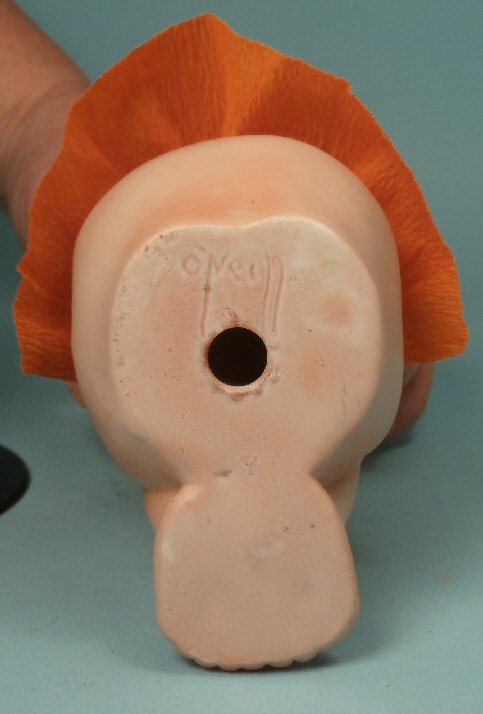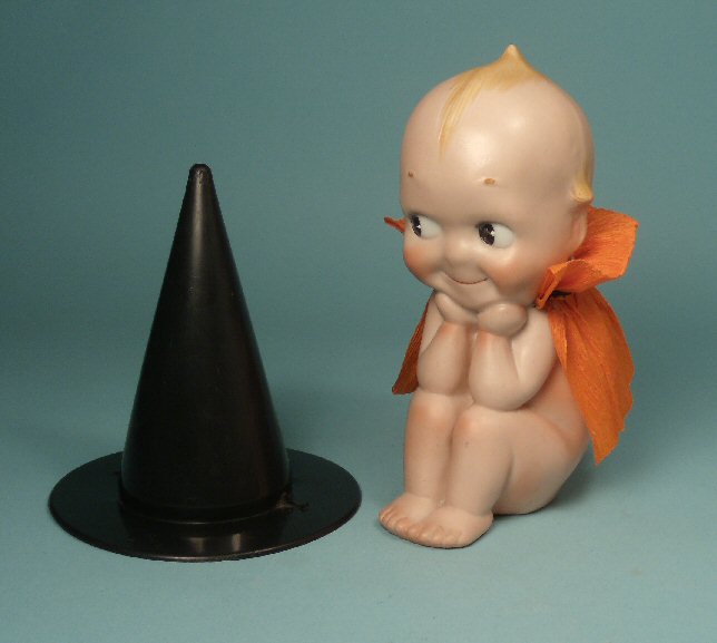 What a fabulous large size bisque Kewpie Thinker, I believe the largest that was made....he is over 6" high with the top knot included. Made by the German firm of Kestner and designed by Rose O'Neill. c. 1910-15. Great expression, with fantastic eyes looking to the side with white eye dots that protrude quite substantially when viewed from the side. He is dressed in an early orange crepe paper cape with high collar and black crepe paper accent at neck. At one time, a collector has added a fabulous tall hard plastic witch's hat, making him even more appealing. Beautiful condition with no breaks or repairs. This guy is such a charmer! The last photo shows him with a Reclining Kewpie who is 4 1/2" long for size comparison. Reclining Kewpie is sold separately.