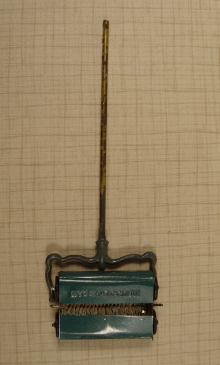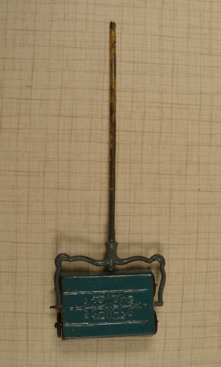 Beautifully made French early carpet sweeper, c. 1900. Base is a lovely blue color in tin with a lovely impressed design on top and the front and back. Has tiny wheels and a natural round brush just like a real carpet sweeper. Beautifully made and this particular piece is very difficult to find, especially in this lovely blue color. Handle is enameled yellow and has wear on the enameling. The rest is in lovely condition especially the blue enameled tin base portion. Overall height including the handle is 4 3/4". Made in France is impressed on the underside. Pictured with other dollhouse accessories, all sold separately.