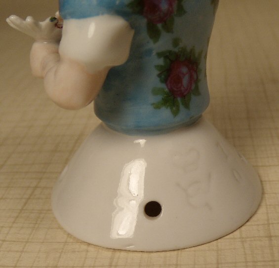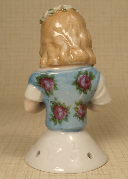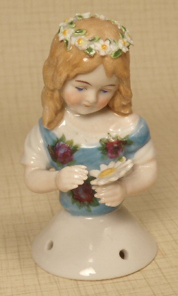 Lovely half doll girl holding a white daisy with yellow center in one hand, made by the reknown German firm of Goebel. Both arms are away from her body. She has a very lovely face long flowing light brown hair. Her molded clothing is blue and white with red roses. She has a crown of daisies which is separately applied to her head...some of the petals have nicks or tiny chips, but these are so small that they are hardly noticable....I have to look with a magnifying glass to see that clearly. She is marked with the Goebel mark on the back as shown in the photos. Height is 3 1/2". c. 1910-15 era. All in great condition with no breaks or repairs except for the described nicks on the flower head wreath.