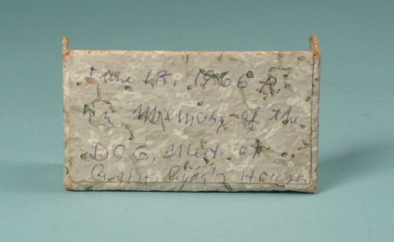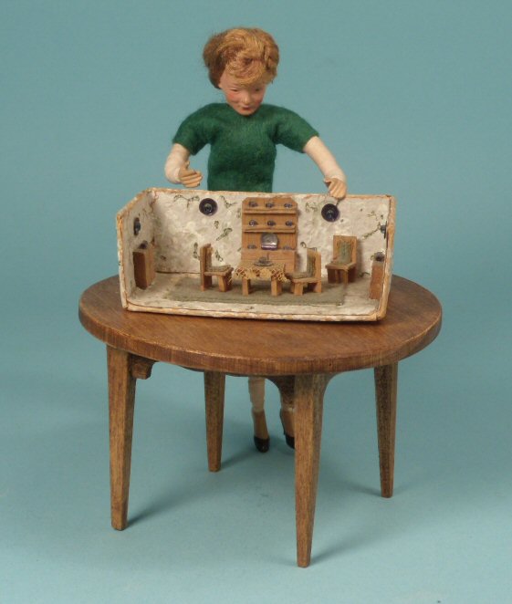 Darling artist made room box for a toy for a child or for the collector dollhouse lady. Made from stiff board, covered in old wallpaper, this tiny scene is set up as a dining room with several chairs, table, china cabinet, and sideboards. All are made from the thinnest wood and some have fabric on them. The tiny dishes have been created from old metal sequins and glass beading. The rug is also thin fabric. The thinnest lace was used for the tablecloth. Very interesting and well made. All items are secured and not removable. The underneath part is signed and I can only partly make it out: .....1966. In memory of the DCG meeting.........House. Exterior dimensions are, 3" long, 1 1/2" deep, 1" high. Nice condition, shows some aging.