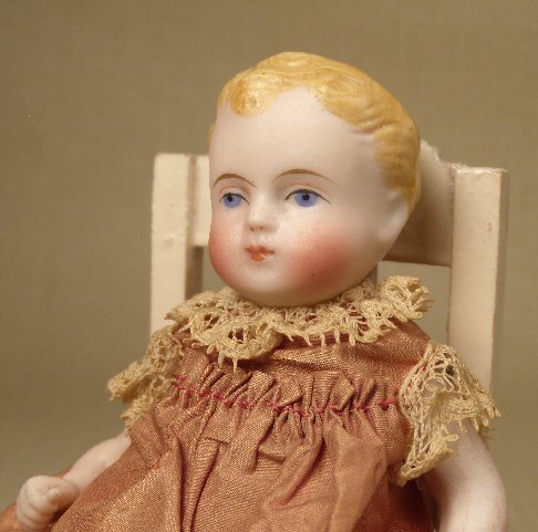 Fantastic and oh so rare all bisque toddler child by Simon & Halbig, made in Germany c. 1880, with the very rare feature of bent knees so that she can sit easily in a chair. Wonderful execution and very high quality, face is fantastic, beautiful modeling of head and body, the trademark of Simon & Halbig. Bare feet, one of the signs of an early all bisque doll. Both hands are molded in fits. Gorgeous face, I just can't say enough about this doll. Height is just a smidge under 4". Great very early peachy/rust silk dress trimmed with lace....I believe is original to her. Dress shows aging. Splendid early lace slip. This doll with her dress came from a family here in Massachusetts, passed down from one generation to the next. She is pictured in an early chair (chair is not for sale). Jointed at arms and legs. Great condition with no breaks, repairs or hairlines.