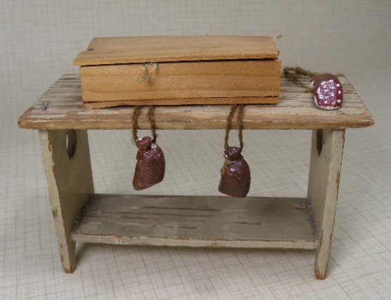 Fabulous German dollhouse food. Three sausages which can be hung in the wooden packing crate or box. One portion of the cover is still attached and the other portion is present--when put together, they fit perfectly. The wooden box underneath is marked: Made in Germany and it still retains the original green packing. The sausages are hand made and painted--they have stringing attached to them so that they can be hung in a dollhouse kitchen, roombox kitchen or a butcher shop or they can be displayed in the wooden crate as pictured. Also shown with a counter taken from a Gottschalk kitchen roombox to demonstrate displaying--counter is not for sale. The wooden crate is 2 7/8" long and 1 1/8" deep. The sausages are approx. 1" long each. Beautifully made and so hard to find, especially in the packing crates. Made from a plaster-type or composition material. Nice condition. There is a little bit of wear or aging.