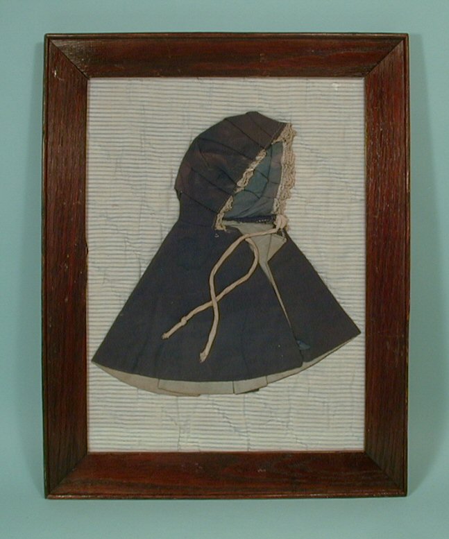 This is the largest of the 3 framed pictures listed. This wonderful decorative item is a very early wooden picture frame with early glass, which has bubbles and imperfections when viewed closely. It holds a very early doll's cape from c. 1870's. The background is an early pale blue and white striped quilt. The overall size of the frame is 12" x 15 1/4". The clothing, quilt glass and frame are all very early, from the 1800's. Brown paper backing has been replaced and new hanger has been added ready to hang on your wall. Great for decorating a doll room or for those who love early fabrics.