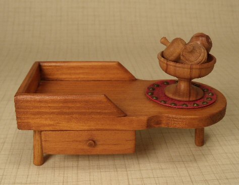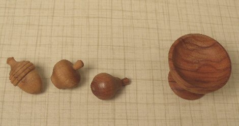 Beautifully made bowl of fruit, turned wood with lovely graining. I believe this was made in Germany after the war, possibly early 1950's. It consists of a pedestal bowl, a pear, an apple, and an oversized acorn. All very detailed and well done. The grouping is pictured on a Toncoss coffee table (sold separately) for size comparison. The height of the bowl is 3/4" and each fruit is approximately 5/8" long including the stems. Lovely condition.