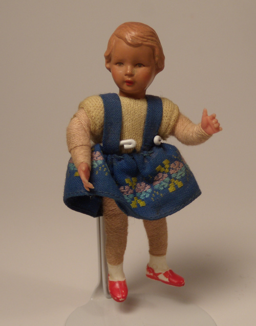 Darling little girl made by the firm of Caco in Germany after World War II. She has her original clothing consisting of a cream color short sleeve jersey shirt and blue skirt with machine embroidered flowers all the way around and matching straps, so evocative of the 1950's era. She has a darling little face with molded waves and curls in the back. She is 3" high and in very nice condition, a tiny bit of wear on her red painted shoes. The beauty of these Caco dolls is that they are bendable and posable, either standing, sitting or can be adjusted to many other poses. Here, she is shown sitting in a Warren Dick hand-made child size wing chair with a mother doll standing next to her. Mother and wing chair are sold separately.