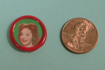 What a great accessory for the fashion conscience doll of the 1950's and for those who love the movie star collectibles of the 1950's. This is a tiny mirror to be held in the hand or placed in a doll's pocketbook; the back has a picture of 1950's movie star Susan Hayward. The frame is bright red plastic. 3/4" diameter and shown with a penny for size comparison. It is in very nice condition, with picture and red frame nice and bright, but the mirror has some silvering loss.