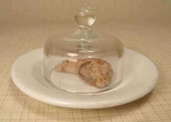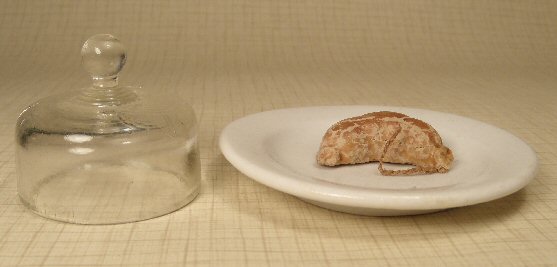 This is an extremely early set consisting of a hand-pressed porcelain plate (thereby making the sides uneven--a sign of very early porcelain), glass cover made with the mold/blown method under which is an early Scottish haggis which still has the original stringing with which is was tied. Great early doll accessory, ready to display with a doll or as an accompaniment to doll furniture. All in great condition. This set is very rare and early, c. 1865-75. Diameter of plate is 3 3/8", overall height to top of glass handle is 2 1/4". Came from a collection of very early doll kitchen accessories. This matches the other set with country bread inside, sold separately.
