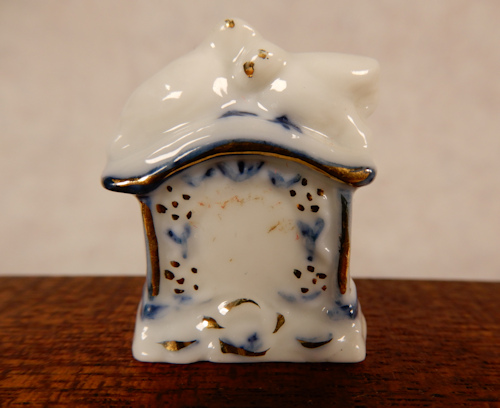 Beautifully made glazed porcelain mantle clock, artist made, c. 1980. The top portion features two white snuggling doves with gold painted eyes; their tiny feet are painted in blue. The rest of the clock is painted in a lovely blue and gold design both on the front and the back and the face of the clock is paper. This would be a showpiece in a dollhouse as it displays beautifully. 1 inch scale, 1 1/4" high, 1" wide at widest point near top. I cannot find a signature on this lovely piece. Also pictured with the blue and while vase (sold separately) on a Lynnfield buffet, c. 1950, to show size comparison.