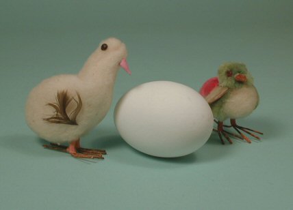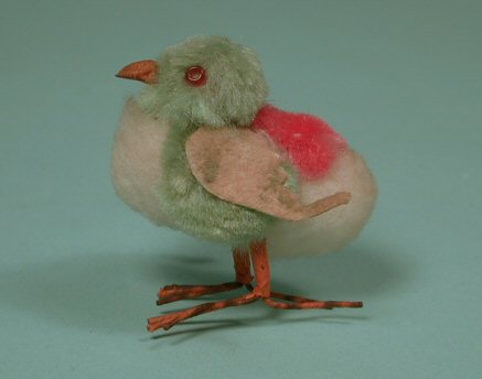 Colorful small chick made from cotton with orange color metal wire feet. Wings are made from cardboard with flocking on the top and beak is papier mache. Eyes are attached glass beading. Very well made. c. 1920's. 2 1/4" high and 2" long. Pictured with another spun cotton chick (sold separately) and a real chicken egg for size comparison. These make a darling Easter scene or for a decoration any time of the year.