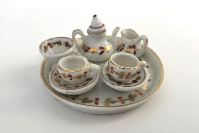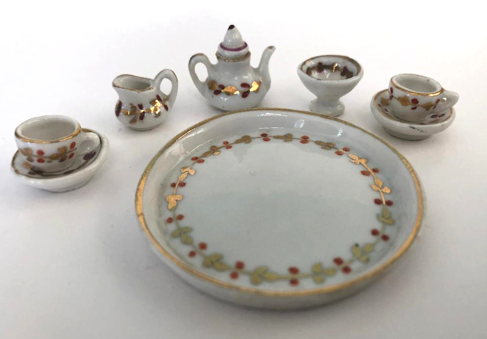 This is a very hard-to-find 1 inch scale German porcelain tea set on matching tray. This tiny set consists of a tea pot with cover, sugar, creamer, and two cups and saucers all sitting on the matching tray. Lovely color scheme of gold and rust color vines on white background. The tray underneath is marked Germany. Made c. 1910-15 period. It is so difficult to find complete early tea sets such as this, especially in dollhouse size. Great condition. Height of sugar is 1/2". Height of cup is 5/16". Diameter of tray is 2".