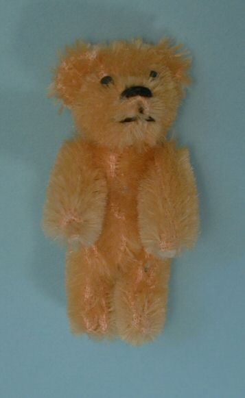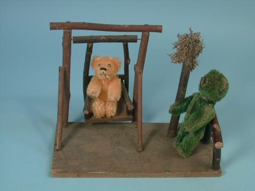 What a sweet little gold colored Schuco teddy bear in really nice condition. He is 2 1/2" high and was produced in Germany c. 1950. He is fully jointed. His appealing little face has bead eyes and black stitched nose and mouth. This darling little guy is shown with his green Schuco companion--they take turns on the early German swing. (Green Schuco bear and wooden swing are sold separately.)