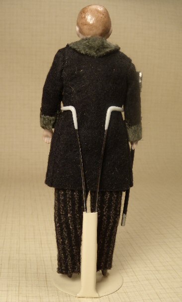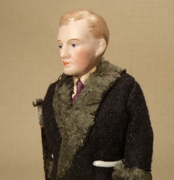 Fantastic and stately dollhouse gentleman made by the German firm of Kestner, c. 1910-15 era. Great bisque head with a serious expression. He carries his original wooden cane with a metal handle made by Gerlach. He wears his original splendid double-breasted felt wool overcoat which has a faux fur collar and cuffs, the buttons of which are Dresden paper, and faux pocket. Underneath his overcoat, one can see his white shirt and collar and a deep purple tie and he also wears elegant wool striped slacks. Shoes are molded bisque and painted black. He is just simply stately and elegant, a man-about-town, ready to move into your early dollhouse. He is 6 1/8" high. Head, arms and shoes are bisque, body is cloth. The cane was attached to his sleeve with thread many years ago. Excellent condition. He is also pictured with a wonderful huntboard and Gerlach lamp with glass shade (both sold separately) for size comparison.