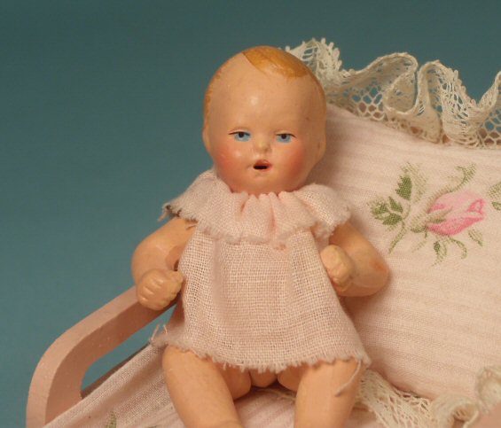 Sweet little German baby, all bisque, and is what is referred to as painted bisque, which has not been fired in, from the 1930's. She has a darling little face with bright blue eyes and an open mouth as if she is baby talking. Hair is painted a short, dark blond with some molded curls in the back. She is marked Germany on the back of the neck. She wears her original little pink dress with matching collar. Her arms and legs are wire jointed. Overall length is 2 7/8". Nice condition...I only detect a few very minor paint rubs on the back of the legs. Pictured on a Strombecker child's bed (bed is not for sale) for size comparison.