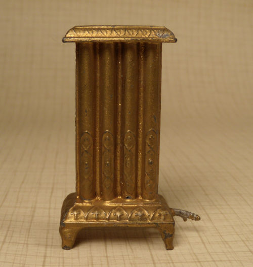 The all-metal radiator is a hard-to-find accessory sold in the Tynietoy catalogs, c. 1925. It was made by the Gerlach firm in Germany. Lovely embossed designs all around. Enameled in gold. Nice condition with minimal wear. 2 1/2" high.
