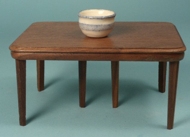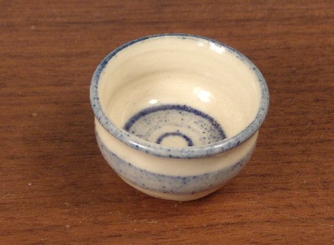 Nice deep ceramic bowl with circular patterns inside and outside in a cream and blue pattern. Surface is glazed. Artist made as it is marked underneath: G. Very attractive and well made. I believe this is from the 1970's. Diameter of bowl is 1 1/8" and height is 1/2". Pictured on a Strombecker table, table sold separately, for size comparison.