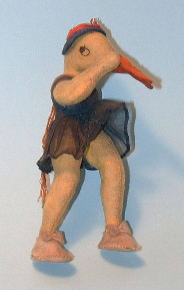 What a funny, whimsical girl duck in quite a pose! She looks like she is heading off in quite a hurry. She was made in the 1920 era from felt and dressed in a navy blue organdy dress and matching felt cloche hat. She is unjointed and 5 1/2" high. Very good condition.