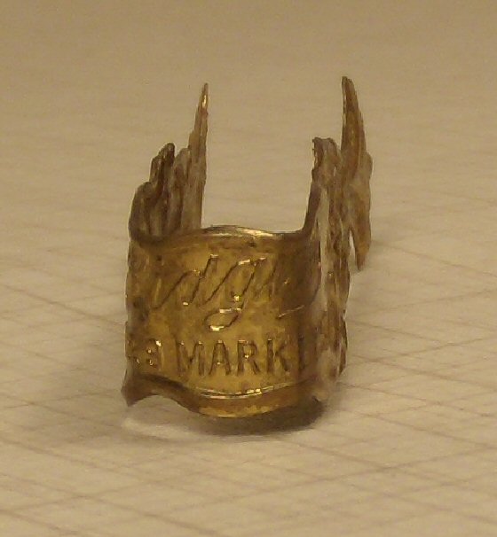 Great Ormolu sugar tongs as an accessory for the doll, either with dinner, serving tea, or in the doll kitchen. Length of tongs is 2 1/4". Lovely impressed designs and the end has the wording impressed: Ridgway, 789 Market St. This is a great advertising item and so lovely for a lady doll. Also pictured on an early dresser that is 13 1/4" high and with a lovely china doll who is 13" high for size comparison. All items are sold separately. c. 1890. German made.