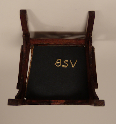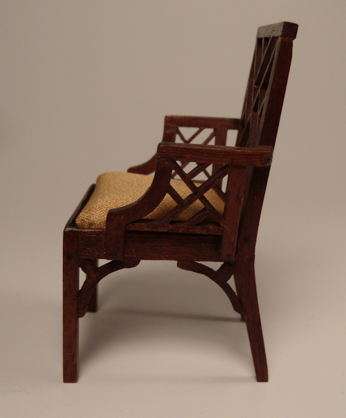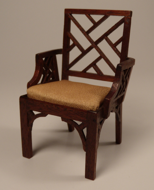 Beautifully made Chippendale arm chair in the Chinese style from the 1970's by reknown miniature artist, Betty Valentine. Gorgeous oriental design at back rest, arms side and by the 4 legs as shown in the photos. Seat is upholstered in gold satin. Wonderful mahogany finish. Signed at the bottom: BSV. Betty Valentine's work is now difficult to find especially in such great condition. Height to the top is 3 1/8 inches. This wonderful chair has come out of my own long-time collection.