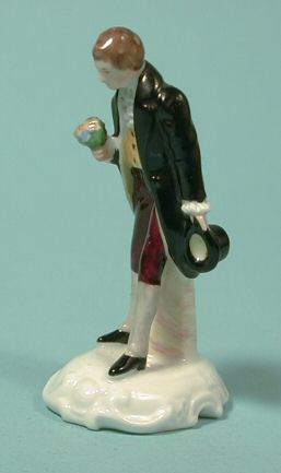 This wonderfully executed young gentleman was produced by the Rosenthal firm in Germany c.1900. He holds a bouquet in one hand his top hat in the other. He is marked with Rosenthal on the bottom and is also artist signed. Finely made, this gent is 2 1/2" tall. Great condition with no breaks or repairs.