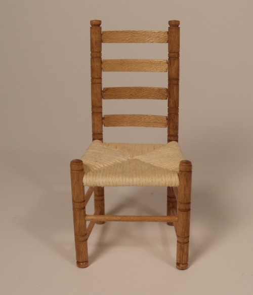 Well made ladder-back maple wood chair with turned legs and sides with 4 curved back rests. The seat is finely woven from stringing and very precise which must have taken a long time to accomplish. Nice smooth finish. Must have been a master craftsman but, unfortunately, there is no signature. c. 1980. Great condition with no breaks or repairs and the woven seat is very clean. 1" scale. The chair is 3 1/2" high.