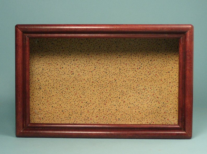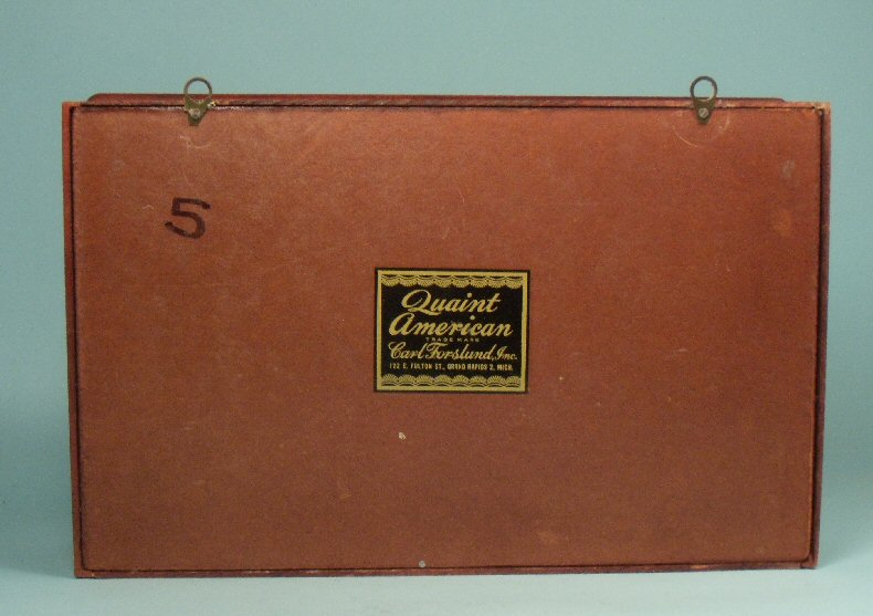 So rare and hard to find, this lovely shadow box was created to specifically hold the delicate Carl Forslund dollhouse furniture. The shadow boxes were made for even a shorter period than the dollhouse furniture, in early 1940's and beautifully done with the original wallpaper in the back with beige background with red and blue dots in an artistic manner. The box sides and frame are made from hand-rubbed cherry wood with the same beautiful finish as the furniture. Marked on the back with the Carl Forslund label, as shown. Has hooks for hanging. Lovely condition showing just a tiny bit of age. Size is 10 5/8" long, 6 3/4" high and 3" deep. It can hanging on a wall or just set by itself as pictured with Forslund dollhouse furniture. The Forslund shadow box is pictured decorated with Forslund furniture and potted flowers to illustrate what can be done with these fine quality miniatures--all items are sold separately.