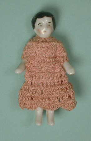 Sweet little frozen Charlotte doll that is 2 3/16" high with molded and painted black hair. She wears her very delicate original pink crocheted dress. Her arms come forward and her feet have lightly molded flat-soled boots. Her face is very delicately painted. Frozen Charlotte dolls are not jointed and made in one piece. This one is quite early, most likely around 1875-80 period. Nice condition with no breaks or repairs. Made in Germany.