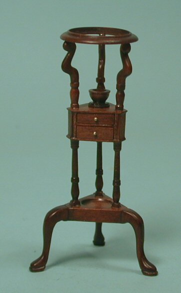Ernie Levy was one of the best known miniaturists of the second half of the 1900's. He is most well-known for his fine quality 1" scale dollhouse furniture made from mohagany and other fine woods and is featured in numerous museum collections. Pictured is a basin stand made very delicately and finely with great curvatures and fine cabriole legs with padded feet. There are 2 tiny triangular shaped draws with miniscule brass pulls which are removable. The workmanship is particularly fine on this piece, dark mahogany with a satiny, soft finish. All in great condition. Height is 3 1/4". Signed on the bottom, Ernie Levy 4-77, which is also pictured.