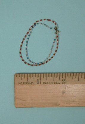 The glass beads on this splendid Victorian doll's necklace has the tiniest beads. It contains two rows of glass beads, the outer portion is red and white and the inner poriton is blue and white. Has early brass hook closure. Shown with ruler for size comparison. Very wonderful and so rare. c. 1880.