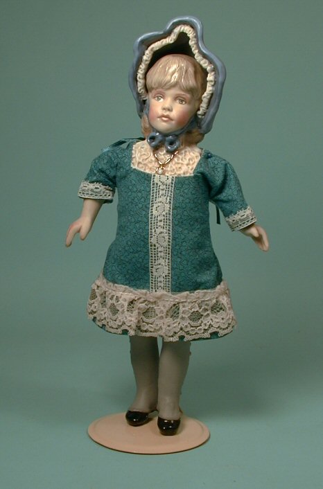 I have been told by an astutue customer that this doll is a portrait of Eleanor Roosevelt as a child. The doll was hand made by Kathy Redmond who is a nationally known American doll artists, has exhibited at 28 UFDC National Conventions and is famous for her children, historical figures and portrait dolls. Pictured is a young girl doll by Kathy Redmond who has an incredibly modeled face with molded blue bonnet edged in porcelain lace and a molded lacy blouse with a gold necklace on her breastplate. The work on this doll is beautifully executed. Her body is cloth with bisque head, hands and legs. Her high black and grey boots have gold buttons as can be seen in the photo. Her elaborate outfit consists of underclothes, a sweet lacy blue & black dress, and a velvet overcoat with attached capelet trimmed in white fur and also at the sleeves. She is a lovely young girl with a darling pouty face. 9 3/4". Signed in the back as shown with Kathy Redmond's logo. Beautiful & clean condition with no breaks or repairs. Kathy Redmond is listed in the major doll value books as an important American doll artist.