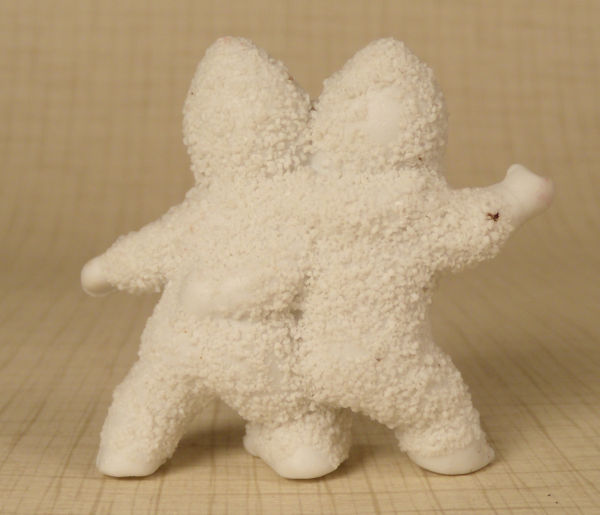 These little twin snow babies are so darling...they are hugging each other, in one piece for the two babies. Sweet little faces with great detailing, which are hand painted. Their snowsuits are covered with "snow" (or fine grout). All bisque in great condition, with no breaks or repairs, minimal grout loss. Little light brown hair peaking down on foreheads from their hoods. Made in German, c. 1915. 1 7/8" high. These little cuties make a great Christmas display with a small Christmas tree.