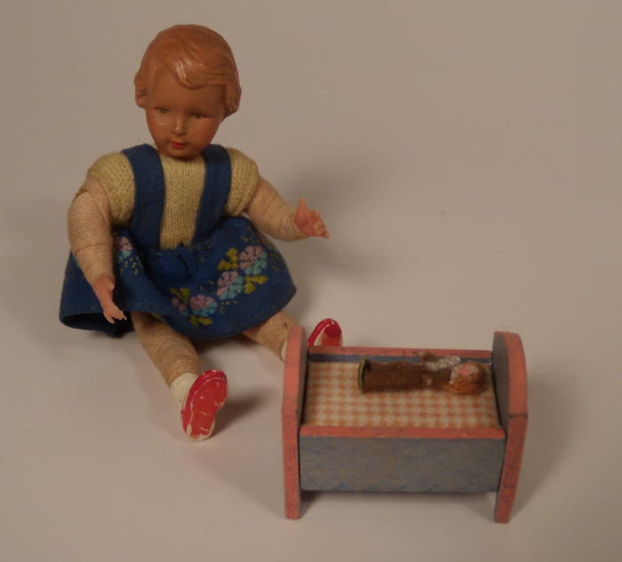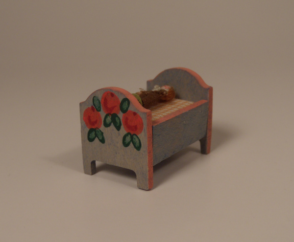 Artist made and signed, this is a tiny hand made doll laying in a bed which is hand decorated in blue, with pink outlines and red flowers with green leaves on the footboard and the headboard. The mattress is covered with pink and white checked fabric. The doll is the tiniest thing you can imagine, just 5/8" inches high and one must look with a magnifying glass to see all the wonderful detailing. The doll is made from wood, face is hand painted, and he has an itsy bitsy wig made from either brown mohair or floss, with a little brown outfit trimmed in blue. And he is signed!! on the bottom of his foot with what looks like two B's back to back, and 1983. Such precise detailing in such a tiny little toy. The bed is 1 1/8" long and 5/8" high Great condition with no breaks or repairs. Also pictured with a child Caco doll (sold separately) for size comparison.